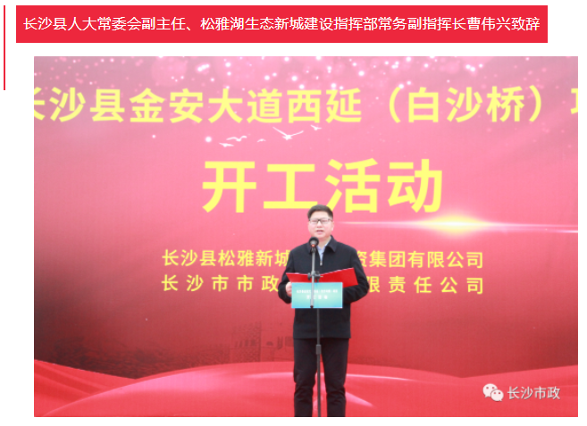 4月19日上午,長(zhǎng)沙縣金安大道(含白沙河橋)西延項(xiàng)目開工活動(dòng)隆重舉行。長(zhǎng)沙市人民政府副秘書長(zhǎng)張躍先,長(zhǎng)沙縣委副書記、縣長(zhǎng)、松雅湖生態(tài)新城建設(shè)指揮部指揮長(zhǎng)陳永高,松雅湖生態(tài)新城建設(shè)指揮部常務(wù)副指揮長(zhǎng)曹偉興,長(zhǎng)沙市市政工程有限責(zé)任公司董事長(zhǎng)陳懷柏出席活動(dòng)。長(zhǎng)沙縣松雅湖生態(tài)新城發(fā)展中心書記羅衛(wèi)滋主持開工活動(dòng)。